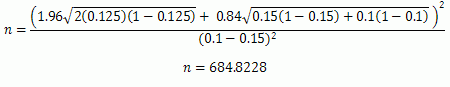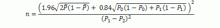 เมื่อเรารู้ค่าต่างๆ เหล่านี้แล้วเราสามารถนำมาคำนวณขนาดของตัวอย่างได้ตามสมการสำหรับการคำนวณ n ใน trial ที่ใช้การวิเคราะห์เป็น Chi-square คือ